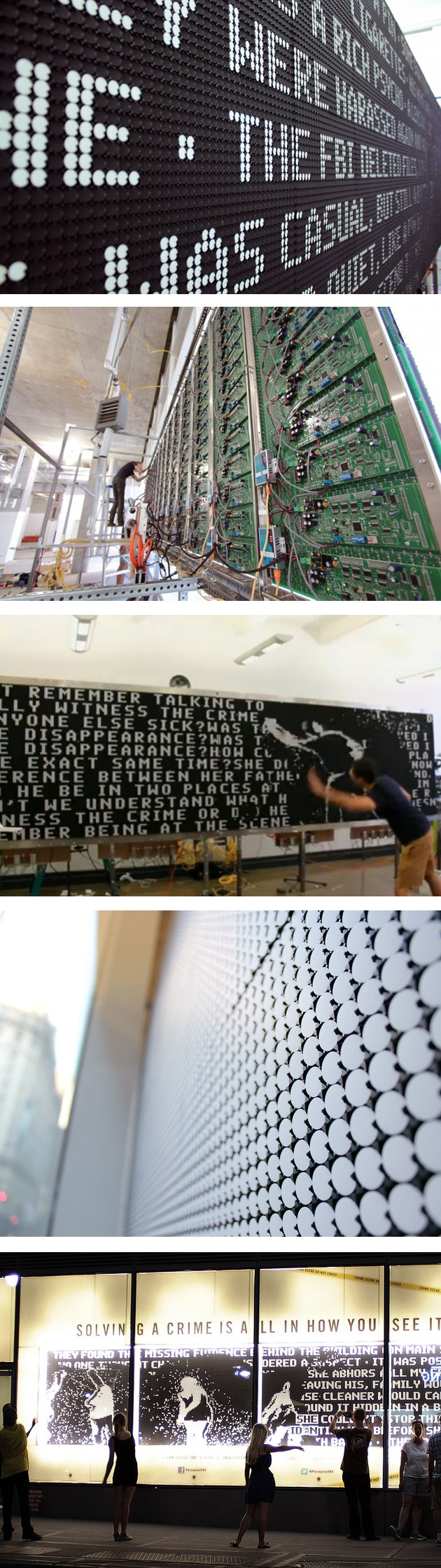 On continue avec cette découverte de la semaine grâce au groupe Breakfast qui nous éblouit en faisant revivre une technologie d’antan. Leur but est simple : créer une expérience pour enquêter sur les rues de New York grâce à un écran électromagnétique géant d’une résolution de 44 000 pixels. Chaque point est noir/ou blanc et réagit au moindre mouvement. Vous pouvez donc interagir avec lui comme un miroir intelligent et mécanique. Cet afficheur est vraiment très rapide pour un objet de mécanique et permet même ainsi d’afficher une image filmée à partir d’une caméra.